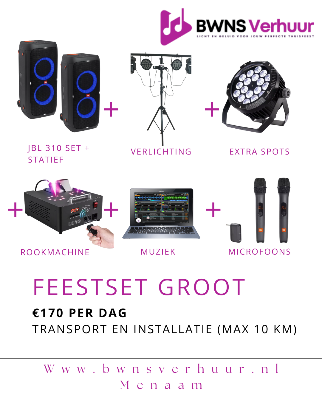 De Feestset groot is perfect voor wie thuis groots wil uitpakken, zonder gedoe. Deze set is geschikt voor feesten tot ongeveer 60 personen en bevat alles wat je nodig hebt voor goed geluid, sfeerlicht en een beetje show.